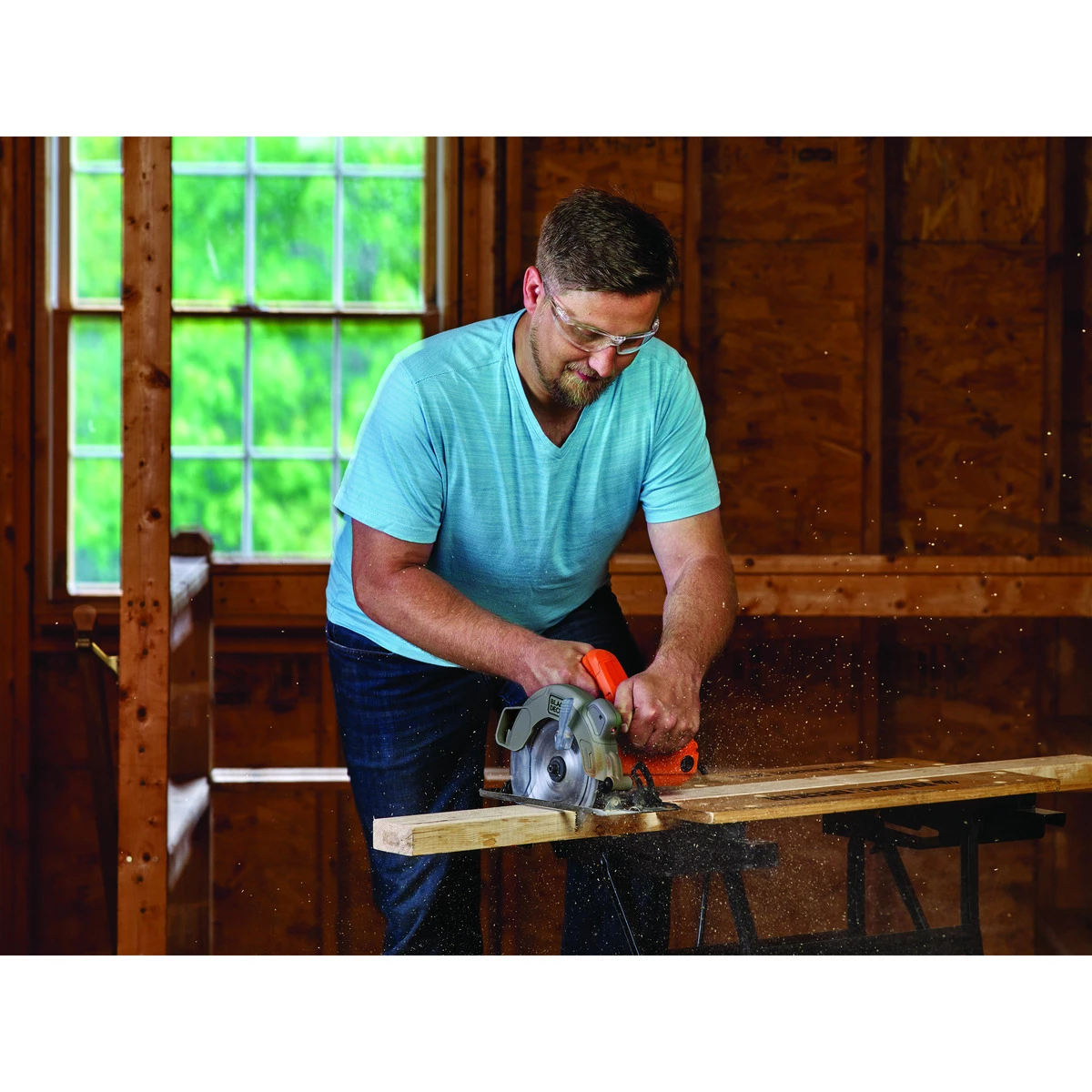 The 13 amp 7-1/4 In. circular saw with laser cut line guide has the power you need to tackle tough jobs. The laser cut line guide provides you with added confidence to make clean and accurate cuts. The 13 amp circular saw with laser is also equipped with a convenient spindle lock, allowing for easy blade changes.