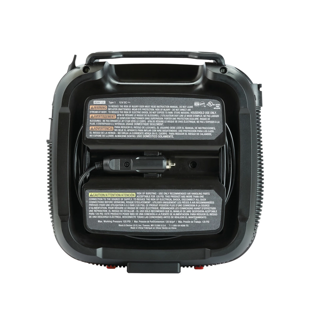 The BLACK+DECKER 12V DC multi-purpose inflator can handle many inflation tasks. Its high-volume output quickly fills large inflatables like rafts and air mattresses, while the deflate function rapidly empties the air for quick cleaning up. The high-pressure output works to inflate tires or sport balls. With a digital pressure gauge and automatic shutoff technology this inflator gives set-it and forget-it peace of mind.