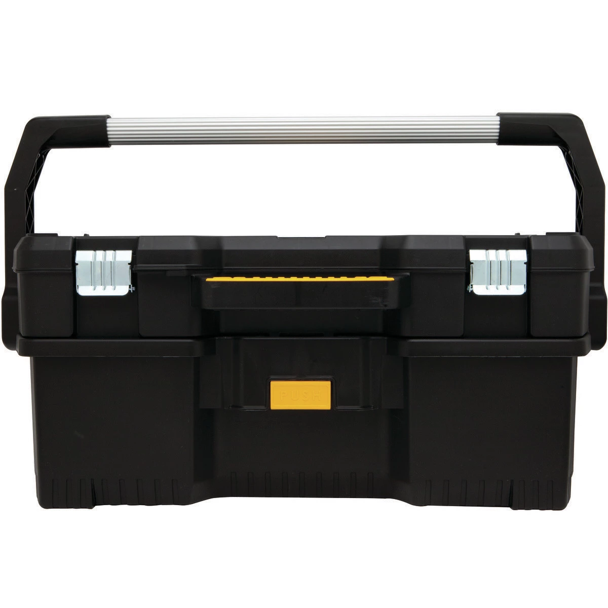 The DEWALT 24 In. tote with power tool case stores a variety of tools with ease. A large sturdy metal handle provides a secure grip for simple carrying. Reliable metal latches keep the lid taut until released. A simple push of a button is all it takes to attach and detach the case to the tote. Rust resistant latches and durable construction combine for countless years of quality storage.The DEWALT 24 In. tote with power tool case stores a variety of tools with ease. A large sturdy metal handle provides a secure grip for simple carrying. Reliable metal latches keep the lid taut until released. A simple push of a button is all it takes to attach and detach the case to the tote. Rust resistant latches and durable construction combine for countless years of quality storage.
