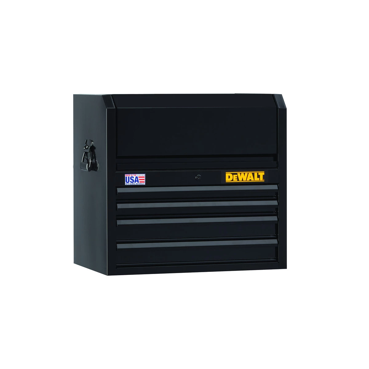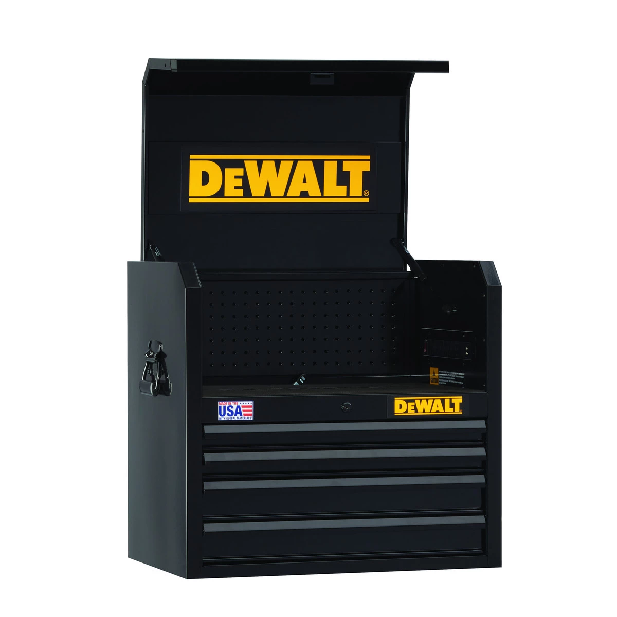 This 700 Series 26-inch wide 4-Drawer Tool Chest is constructed of double-wall steel for strength and durability. It has four 100-pound load capacity drawers, featuring full-extension ball-bearing drawer slides with soft close latching for smooth and quiet operation. It also has a heavy-duty keyed internal locking system to safeguard tools. Conveniently charge your power tools, batteries, and electronics in the under-lid area which features gas struts for easy opening and closing. Also included are four DEWALT embossed drawer liners and one DEWALT embossed top mat. Recommended with this unit is our 700 Series 26-inch wide 6-Drawer Rolling Tool Cabinet (DWST22760), sold separately.