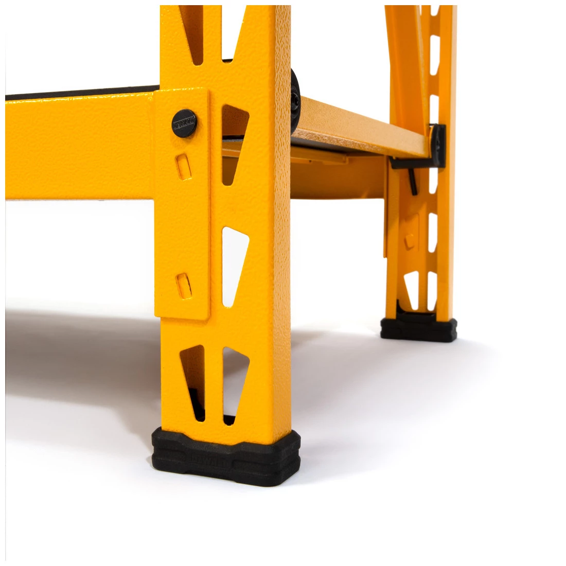 The DEWALT DXST4500 4-Foot Tall, 3 Shelf Industrial Rack was designed and engineered to provide heavy-duty, professional level storage. This rack features innovative details that aren’t typically found on industrial racks such as solid laminate decks, safety straps with weld nuts for ease of assembly, and top caps that protect both you and your items from possible damage. The three black laminate wood composite decks can each support an evenly distributed 1,500 lb. for a total of 4,500 lb. The uprights, crossbeams, and support straps are all made from powder-coated steel and are designed so that once assembled, each shelf has two types of support straps in addition to the crossbeams to prevent them from buckling under pressure. The shelves are adjustable in 2.35-inch increments and the locking pins ensure that each shelf is properly installed. Glass-filled nylon feet on the uprights protect the powder coat from damage when repositioning the rack in addition to providing a second layer of protection against unwanted moisture and liquid spills while also protecting finished flooring from damage. Each rack also includes 2 stacking plates so you can easily and securely join two racks together vertically or, thanks to the double row design of the uprights, connect them together horizontally to create a complete storage or workspace solution customized for your needs. For easy assembly, the rack hardware kit includes a wrench, hex key, and hex driver bit and two of the four uprights come with pre-installed horizontal and diagonal support beams making getting started fast and stress-free.