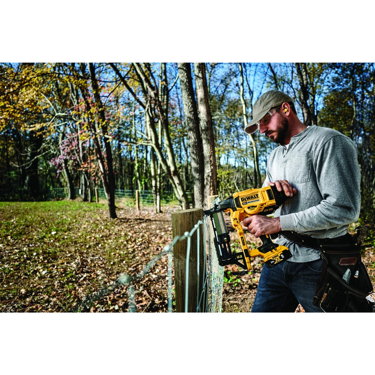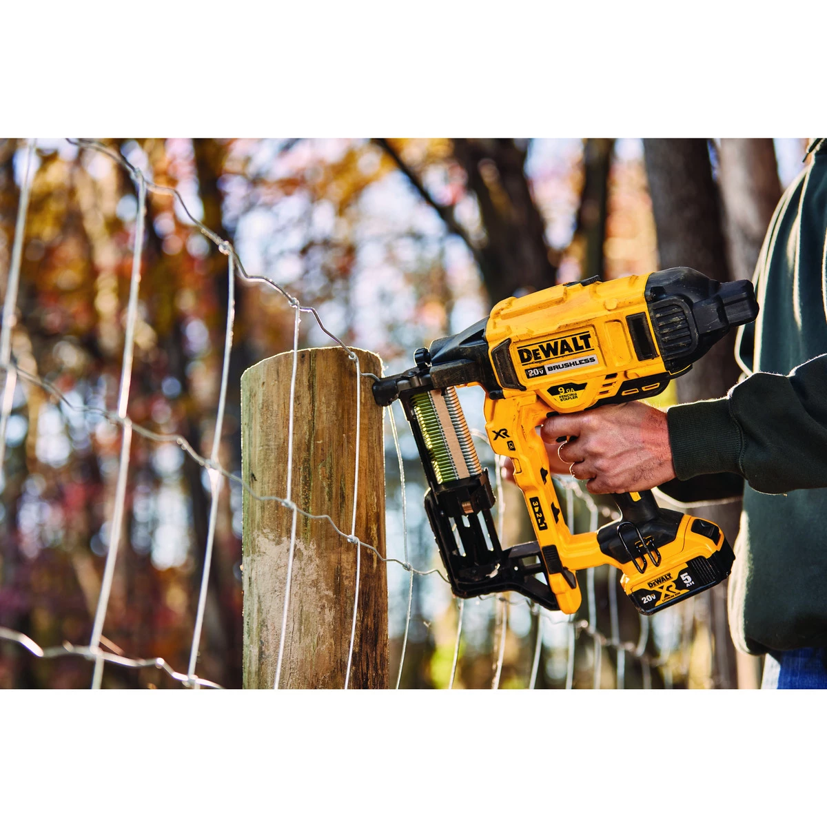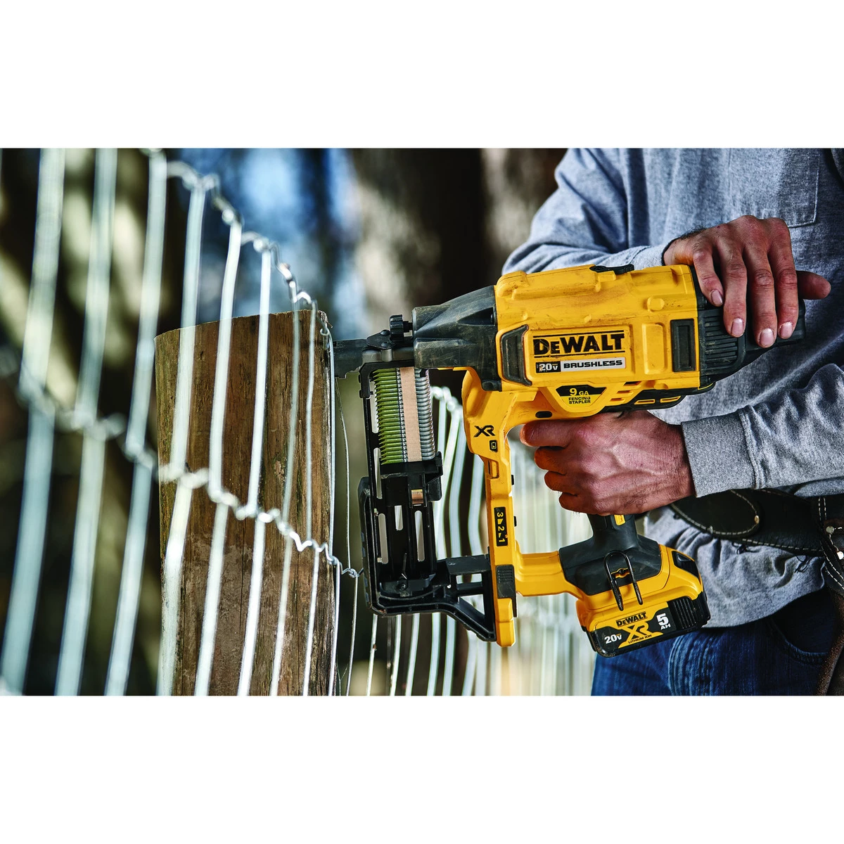 The 20 V MAX XR® cordless fencing stapler, designed for rural applications, is 100% battery operated, eliminating the need for fuel cells and the hassle of a hose and compressor. Variable power settings, tool-free depth of drive and jam clearing give the user confidence to get the job done quickly and efficiently. The ergonomic design, versatility, and convenience makes the DCFS950 a tool for agricultural fencing and utility applications. Compatible with all DEWALT 9 gauge fencing staples available in three common sizes: 1-1/2 in. 1-3/4 in. and 2 in. (sold separately).