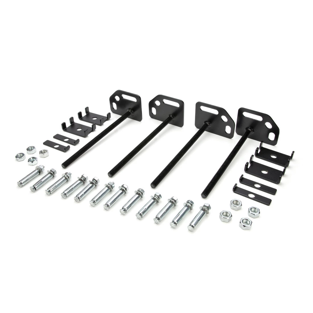 Add additional stability and security to your DEWALT storage rack with the DXSTA04MP Adjustable Floor Mount/Leveling Kit. This pack of 4 durable steel mounting plates replaces the existing glass-filled nylon feet of your DXST10000, DXST4500, or DXST4500-W storage rack. Easy to install, each mounting plate is independently adjustable which allows you to compensate for uneven floors that would otherwise cause twisting of the shelves and can compromise the strength and rigidity of your storage rack. With 7-inches of adjustment range to work with, even the most uneven flooring can be made to securely support a rack. Each of the 4 plates feature 3 holes to allow you to use the 12 included concrete anchor wedges to secure your rack to any cement floor for additional anti-tip security. Compatible with all production dates of DXST10000 and compatible with models DXST4500 and DXST4500-W with production dates after November 2018.