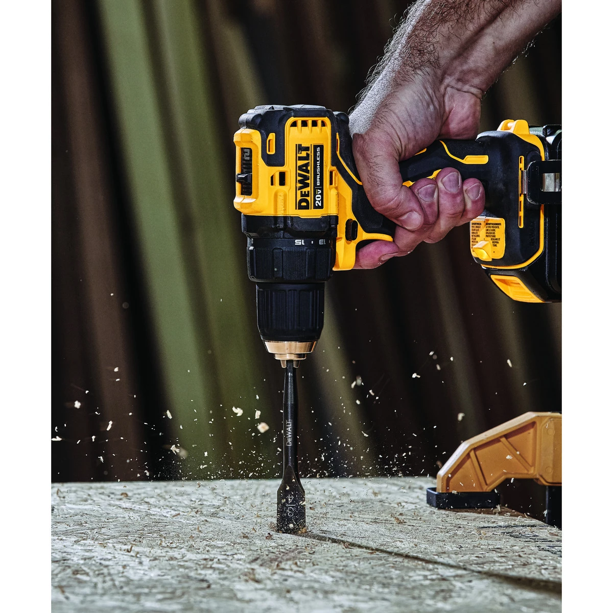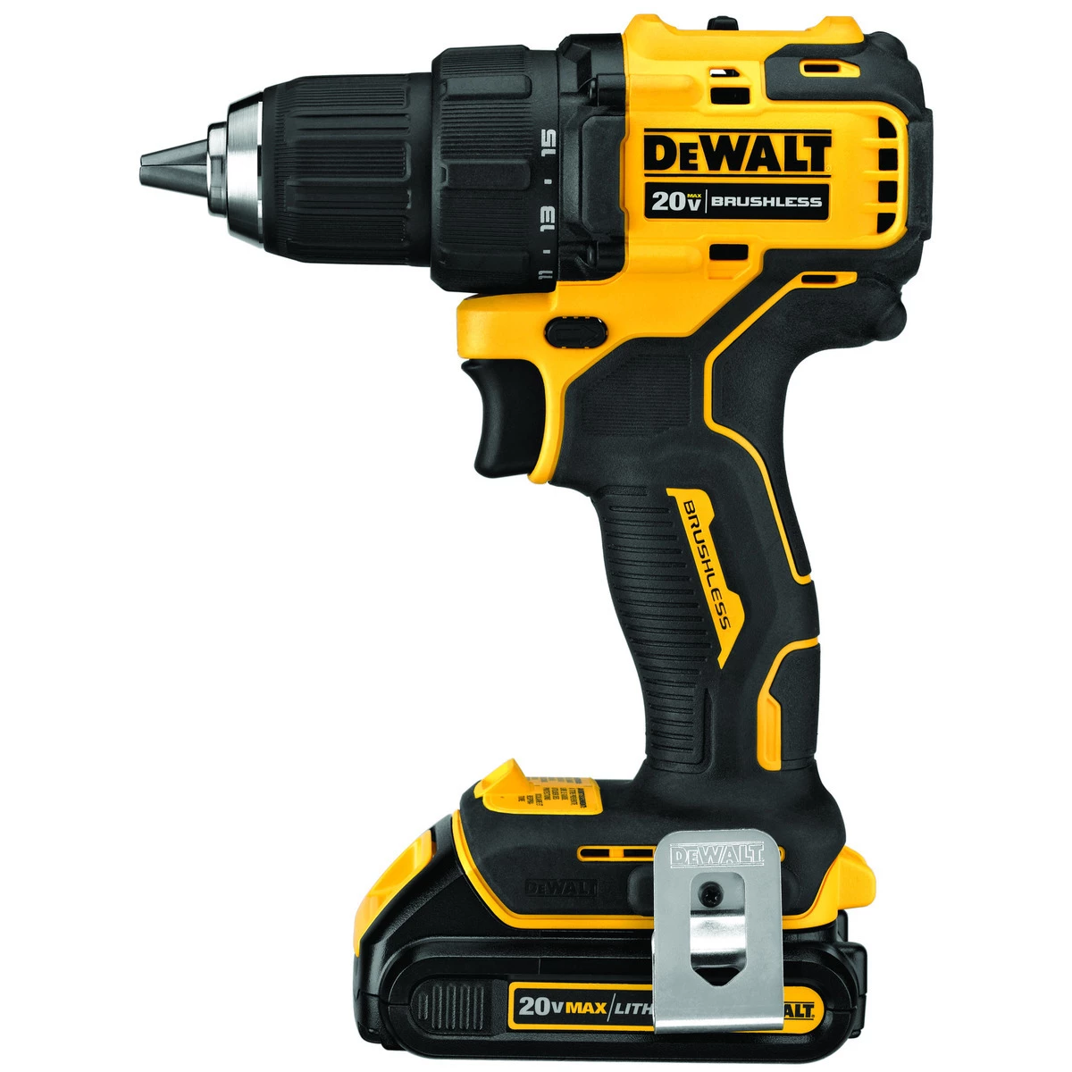 This 20V MAX* Compact Brushless Drill/Driver kit includes two 20V MAX* Lithium Ion Batteries, a charger, and a carrying bag. At only 6.3 in. front to back, this drill features a high performance brushless motor that delivers 340 unit watts outs (UWO) and LED light to provide optimum illumination in dark spaces as you work. For increased comfort, the handle features an ergonomic design for balance and easier tool control along with a removable belt hook. Backed by a DEWALT 3-year limited warrenty so you can buy with confidence.