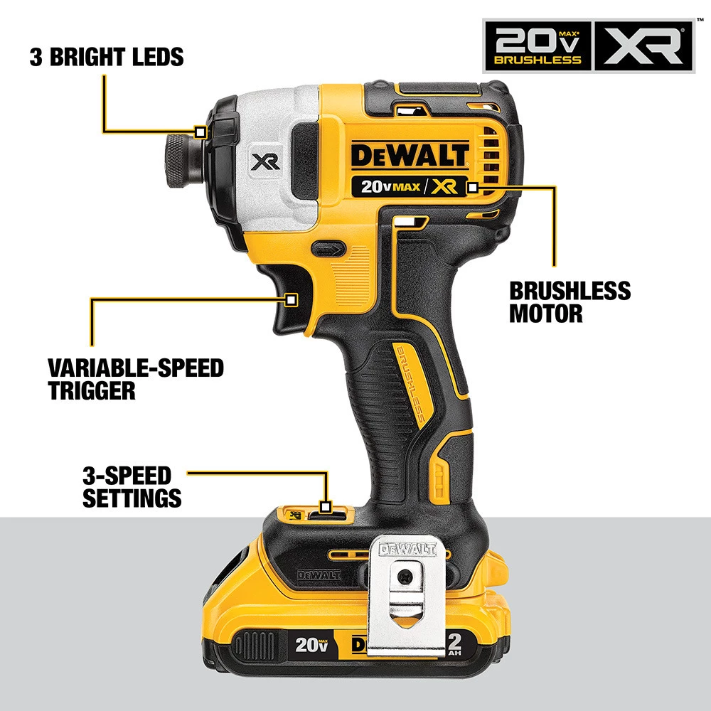 This 2-tool combo Kit features the DCD999 20V MAX 1/2 in. Brushless Cordless Hammer Drill/Driver with FLEXVOLT ADVANTAGE tool technology. The DCD999 gets up to 42% more power when paired with FLEXVOLT batteries. This kit comes with one DCF887 20V MAX XR Cordless Impact driver, DCB606 FLEXVOLT Battery, 20V MAX 2.0Ah compact battery, 6 Amp charger, and kit bag.