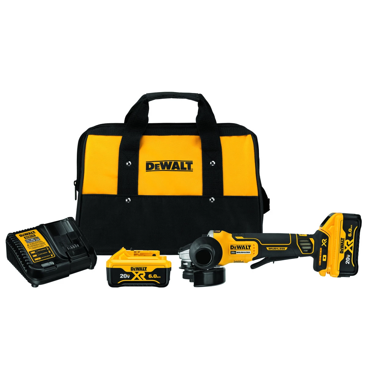 - Includes grinder, side handle, hex key, inner and outer flange, 4.5-in type 27 guard, (2) 6.0 AH DCB206 batteries, DCB115 charger and kit bag