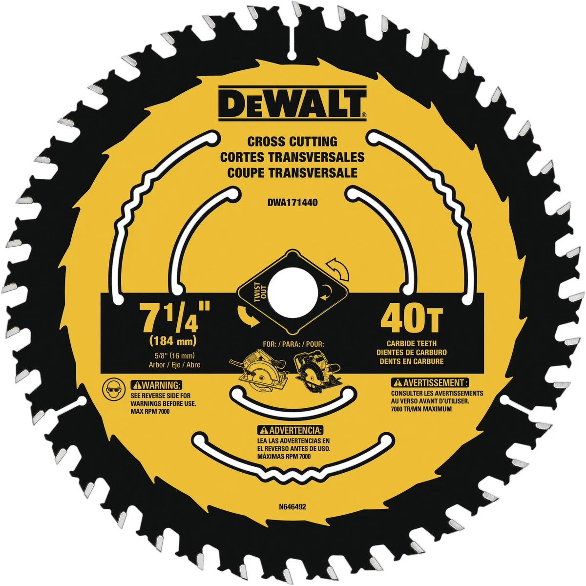 DEWALT 7-1/4-in 40T saw blade with patented body slots reduce vibration for exceptional feel. High-density tungsten carbide for toughness, wear-resistance, and long life. ToughCoat anti-stick coating reduces friction and gumming. Thin kerf design for smooth cuts. Reinforced shoulder for improved carbide support and impact resistance in nail-embedded wood. Optimized for use on both corded and cordless circular saws.