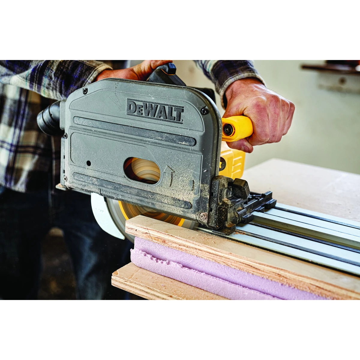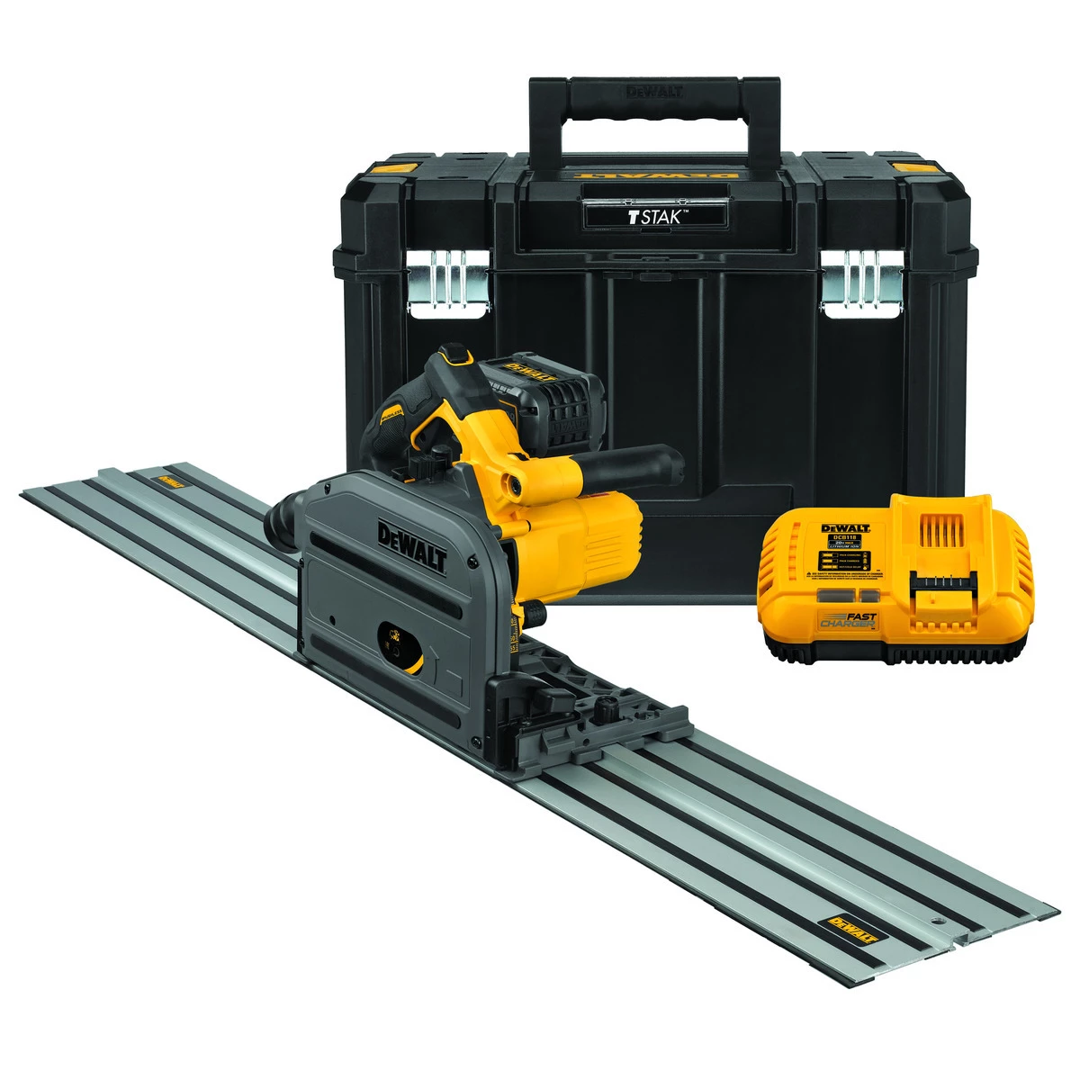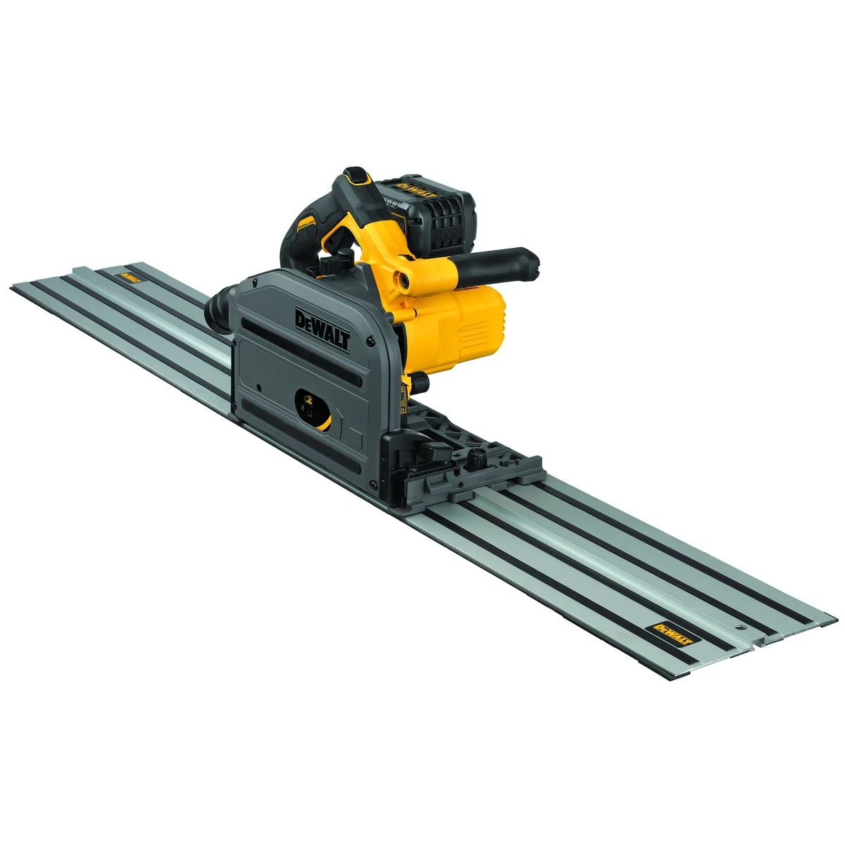 The DCS520 60 V MAX* 6-1/2 In. TrackSaw kit easily Powers through hardwoods up to 2-1/8 In. thick. Features straight plunge mechanism for optimal ergonomics. For use with TrackSaw cutting system to deliver precise, straight, splinter-free cuts.