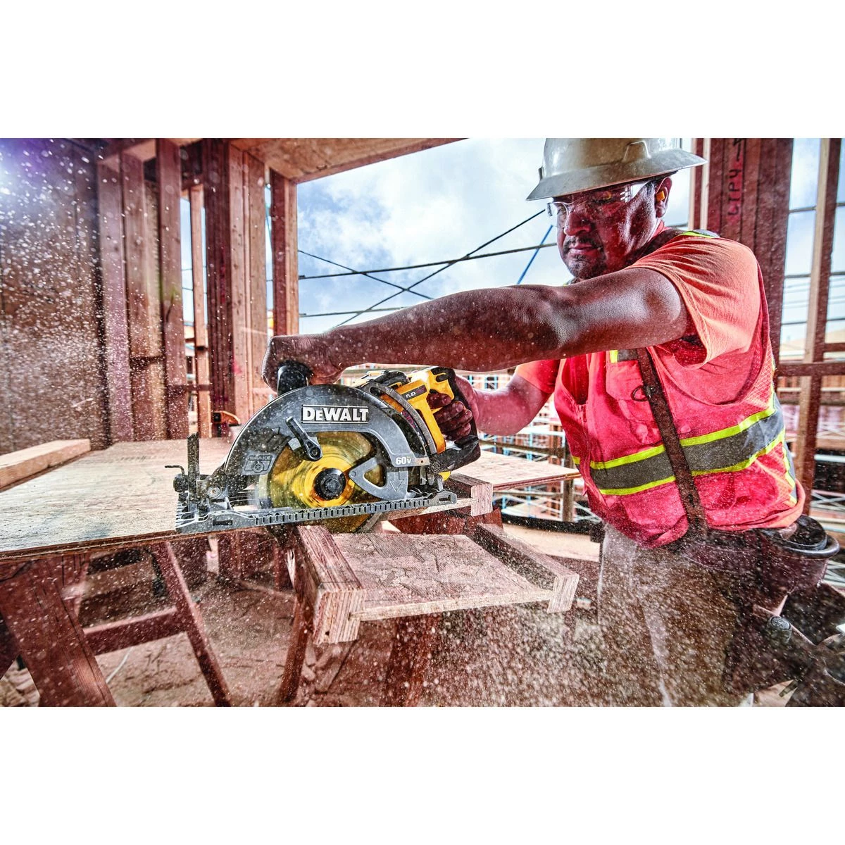 The 60 V MAX* 7-1/4 in. Framing saw with 9.0 Ah battery offers big runtime. The blade is oriented to the left of the motor and the handle is at the rear to optimize line of sight when cutting. An electronic brake helps stop the blade after the trigger is released. Bevel capacity is 53° with stops at 45° and 22.5°. The saw makes smooth, accurate cuts and delivers long runtime with a durable, high-grade magnesium shoe and an efficient brushless motor.