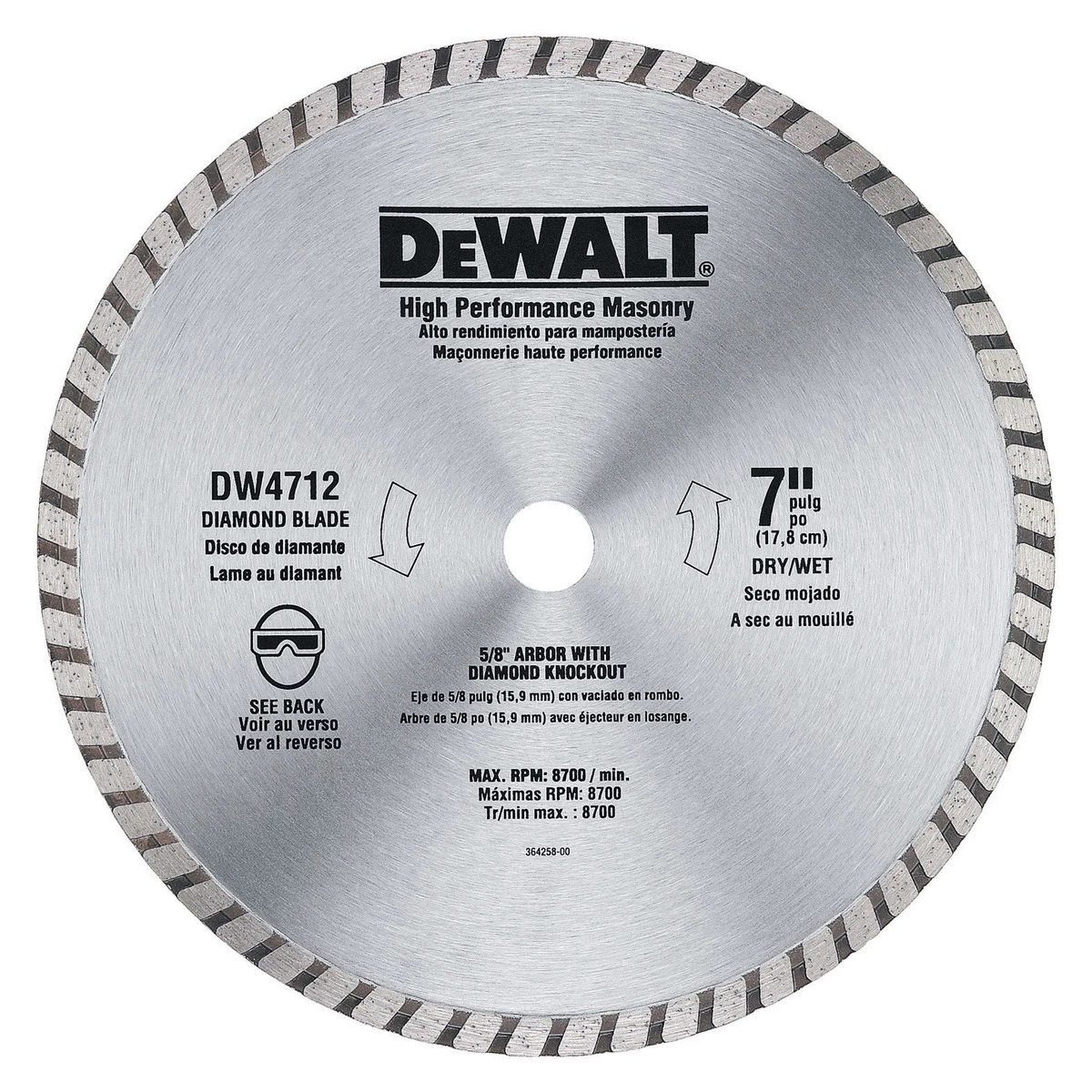 The DEWALT 7-in x 5/8-in high performance diamond masonry blade has been thoroughly tested to ensure that its diamond matrix provides 200 times the life of conventional abrasives. Enhanced material removal and a faster cut rate at a constant depth allow you to increase efficiency on important jobs. With a thin kerf, this blade increases speed while minimizing dust, so you never have to sacrifice speed for cleanliness. These proven features allow you to work with confidence, knowing that the DEWALT high performance diamond masonry blade is the right tool for use with thinner and softer masonry materials.