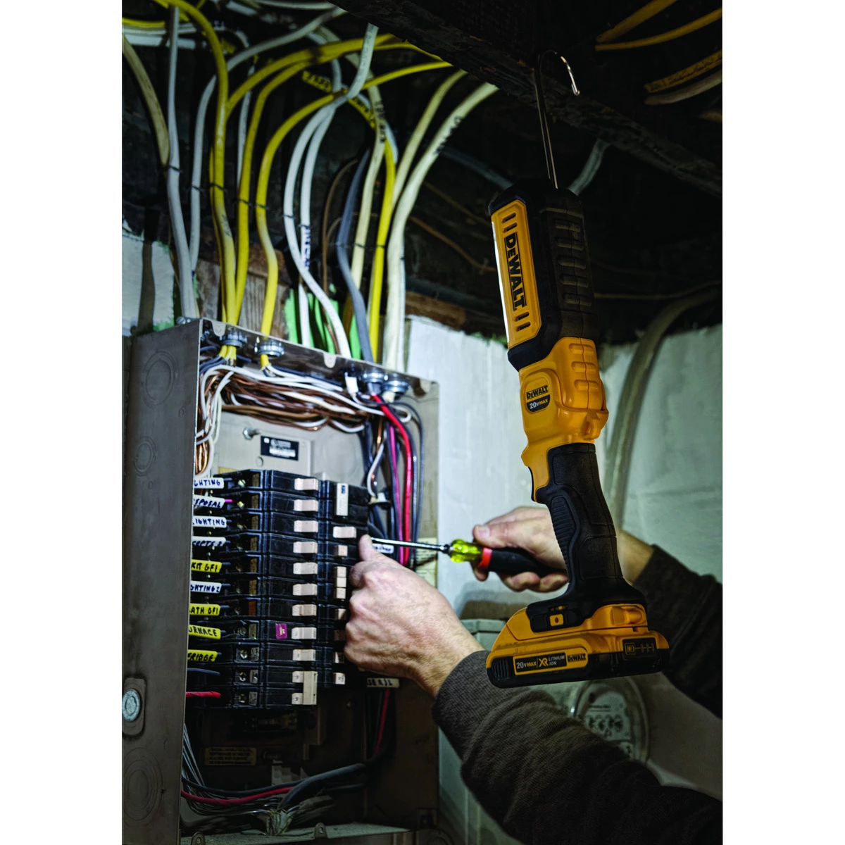 DEWALT 20 V MAX LED hand held area light. Over-molded lens cover provides increased durability and a non-maring surfice for the jobsite. Belt hook compatible – add belt hook accessory to provide increased versatility for transportation. 3 Bright LED’s illuminates dark jobsite work areas. 2 Brightness settings 500 and 250 lm provides flexibility for maximum light output or extended runtime. 140 Degree pivoting head provides versatility for lighting work surfaces. Built-in telescoping and 360 Degree rotating hook allows unit to hang from 2 In. materials and multiple locations.
