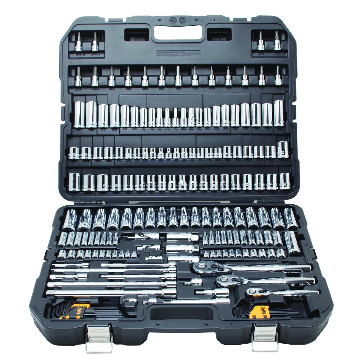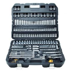 The DEWALT DWMT75049 192 pc. Mechanics tools set offers a number of features that appeal to mechanics tool users. These pieces have knurled beauty rings that provide a non-slip gripping surface, along with deep laser etched markings for easy socket size identification. A 5 degree arc swing and slim head design perfect for maneuverability in constricted areas. The 72-tooth gear system is designed for high torque ratcheting and a low profile directional lever helps reduce catch points and for easy one-hand operation. This all precisely fits into a durable molded case for easy storage and tool protection.