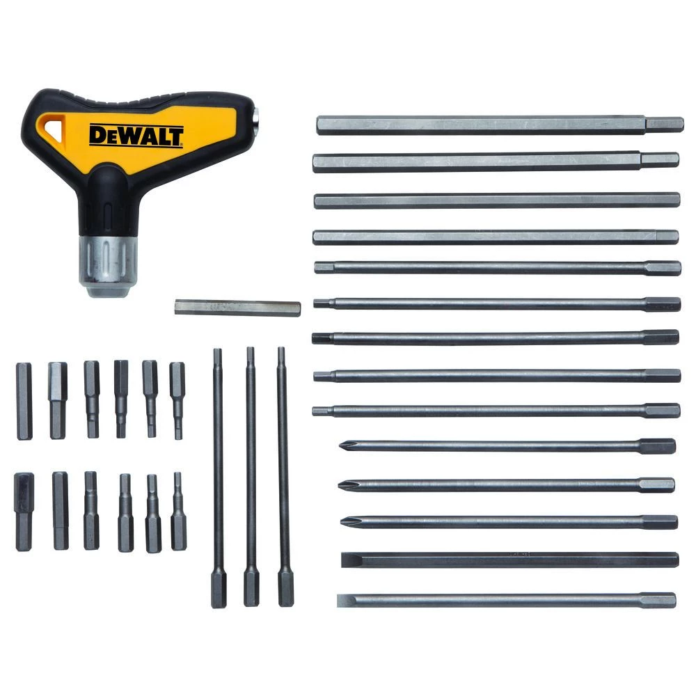 The DEWALT T-handle hex key set features a durable bi material handle with ratcheting mechanism for easy tightening or removal of fasteners. The ratcheting bit holder is magnetic to insure the selected bit stays securely seated in the tool. A second bit holder is located in the heel of the T-handle for easily accessible, high torque applications. Set also includes a compact, portable carrying case and 30 bits in MM, SAE, hex, Phillips, and flat keys.
