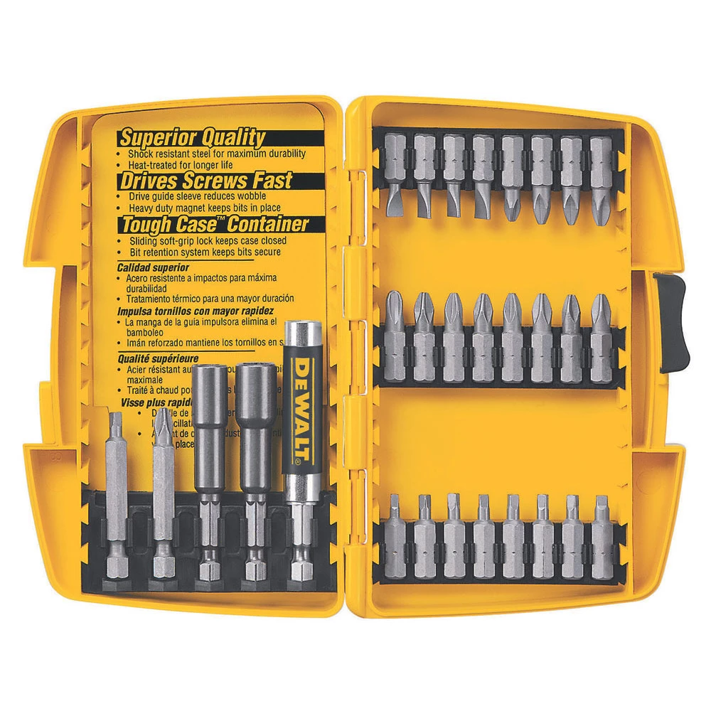 Set made of shock resistant steel for maximum durability with a hardened core for extra strength and reduced breakage. Heat treated to resist breakage and wear. Set includes compact drive guide, nut drivers and slotted, phillips and square recess bits. Case included.