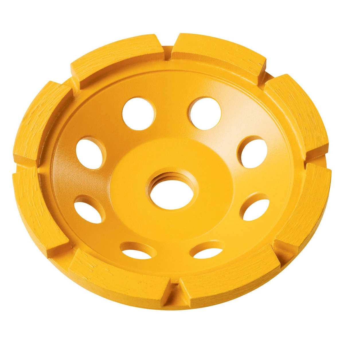 Extended performance diamond matrix provides 350X’s the life of conventional abrasives and Greenguard material removal. Large grinding segments with heat treated steel bodies which provides increases durability and wheel life. Used for dry grinding of concrete and other masonry materials,removing of flashing.