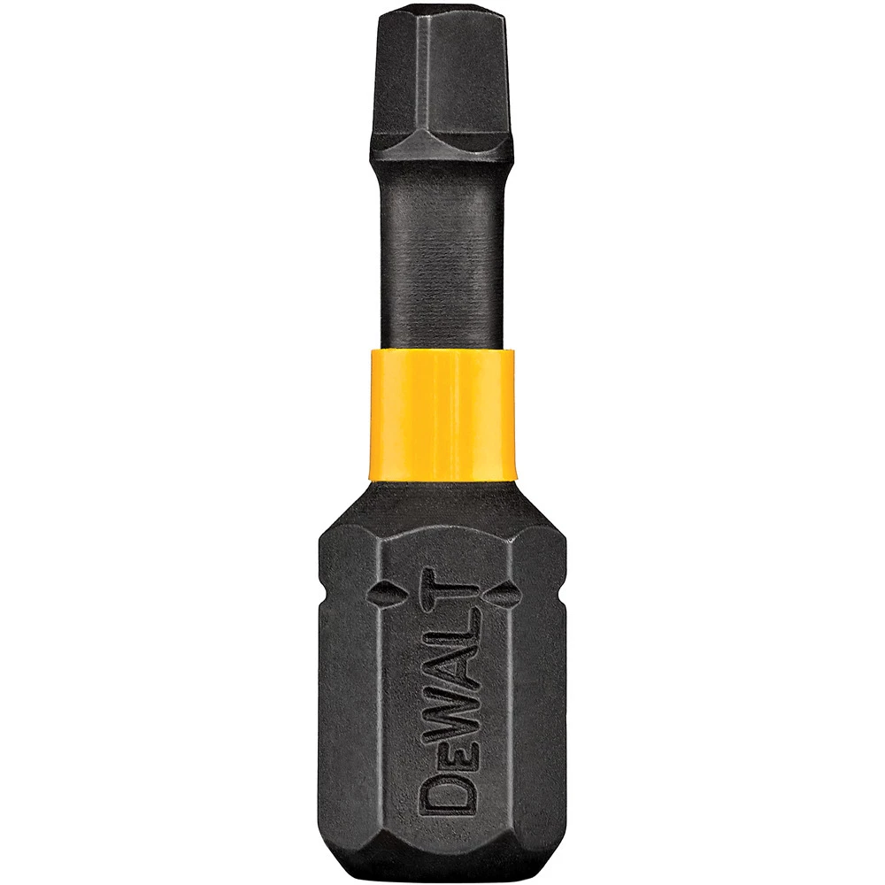 A pack of 2 DEWALT 1-in square #1 impact driver bits, made out of shock resistant tool steel. The advanced hardening process produces maximum durability. These bits can be used in bit tip holders for driving screws into a variety of materials.