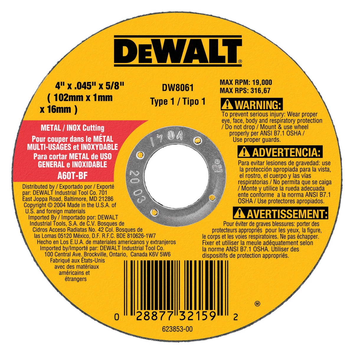 The DEWALT 4-in x 0.045-in x 5/8-in metal and stainless cutting is a professional solution for a range of applications. The wheel is made with high performance aluminum oxide for long life and high material removal and 2 full sheets of fiberglass for durability and safety. DEWALT developed a proprietary material mix to maximize the wheel’s lifespan and help you minimize tool replacement costs. With a high grain concentration, you are assured of aggressive grinding action and smoother running wheels, no matter what the job.