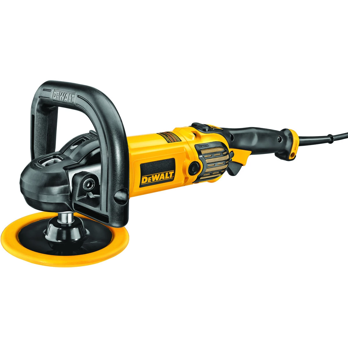 The DEWALT DWP849X 7 In. / 9 In. variable speed polisher has a powerful, 12.0 Amp, all ball-bearing construction motor for long life and durability. It has electronic control that maintains specified speed under load delivering the desired finish results. The conveniently located variable speed dial lets user set maximum speed from 0-600/3500 rpm for different materials and applications. It also has a variable speed trigger allows user to control speed from 0 to dialed maximum setting easily. It has heat-treated, precision-cut steel gears for smooth operation and external brush caps for easy servicing. The large spindle lock button allows for easy and quick backing plate changes. It also features a wool ingestion shield that eliminates wool ingestion increasing tool life and reducing service costs and a non mar rubber gear case cover that reduces surface imperfections and improves gripping surface. Includes polisher, hook and loop backing pad bale and straight side handles.