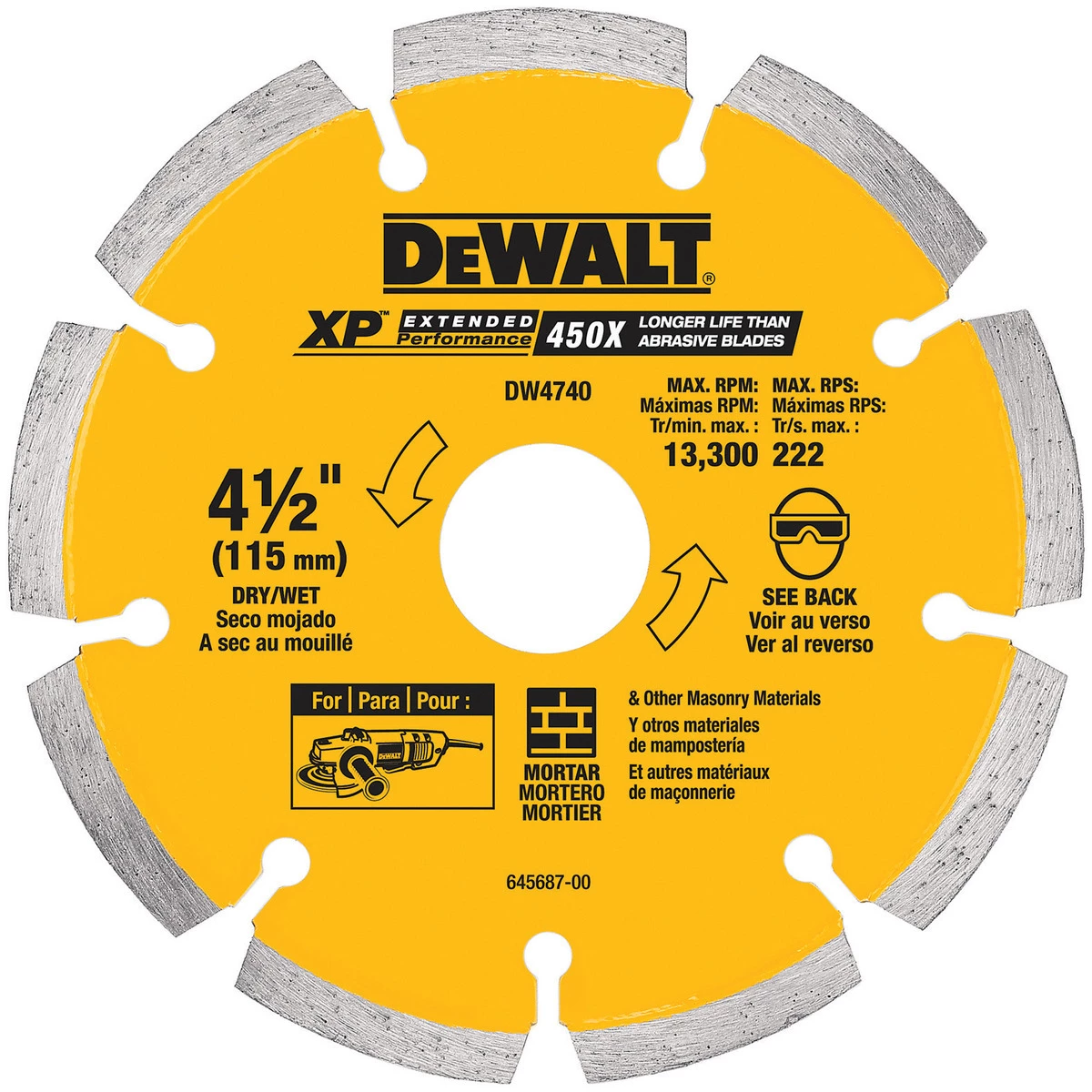 The DEWALT 4.5-in x 0.250 XP tuck point blade delivers professional quality performance and maximizes efficiency, so you can focus on the job instead of worrying about the tool. With an extended performance diamond matrix, this product provides 350 times the lifespan of conventional abrasives. Enhanced material cutting and durability are guaranteed by segmented, laser welded rim blades with heat treated steel bodies. DEWALT has extensively tested this blade’s large diamond cobalt segments to ensure fast, rough cutting across a variety of concrete, stone, and brick applications.