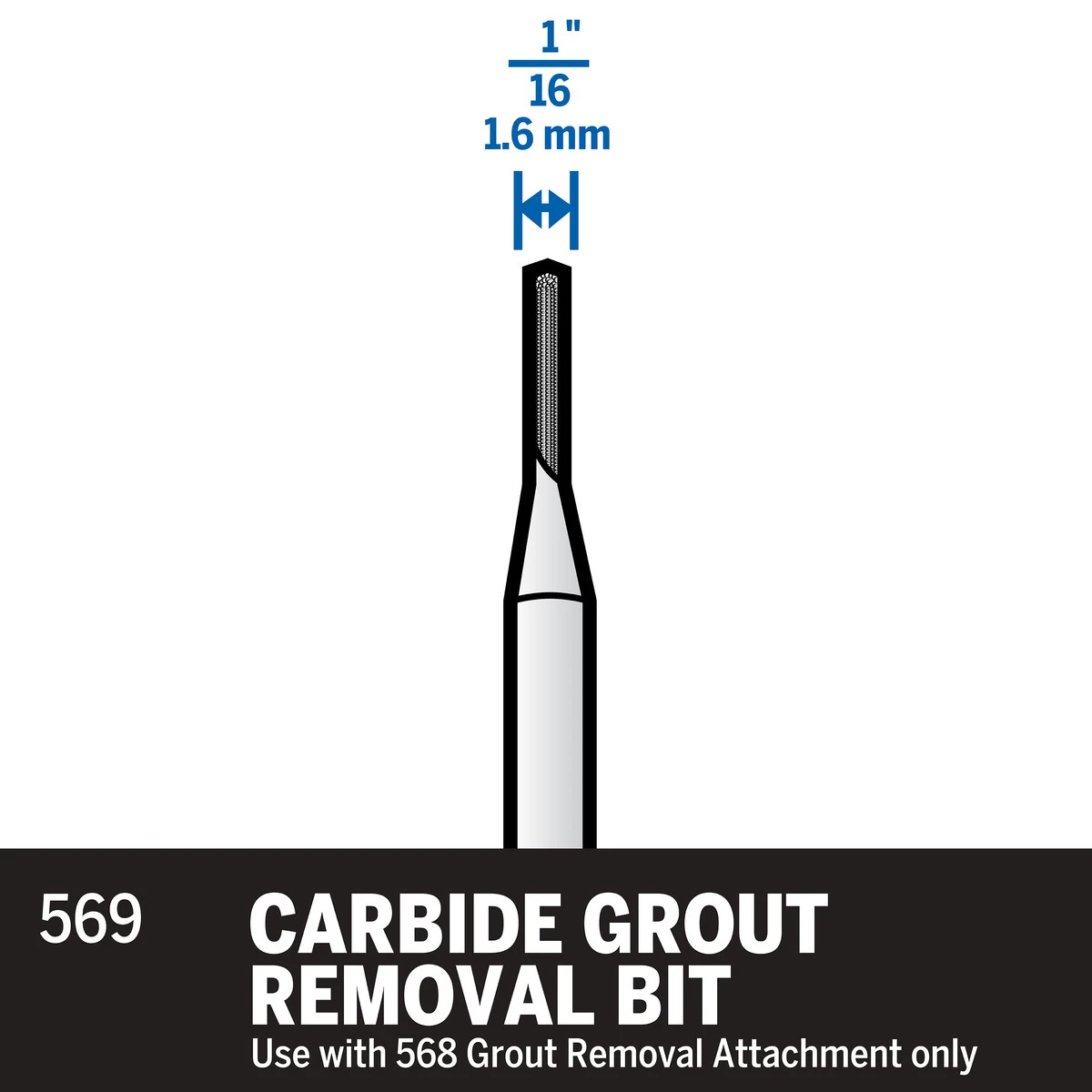 Get the grout out and make re-grouting a breeze. Designed for small repair jobs, the Dremel 569 1/16 In. (1.6mm) Carbide Grout Removal bit is ideal for removing grout between tiles. Can be used to replaced wall and floor grout or removing grout to replace broken tiles. Designed for use with the 568 Grout Removal attachment. For use with all Dremel rotary tools.