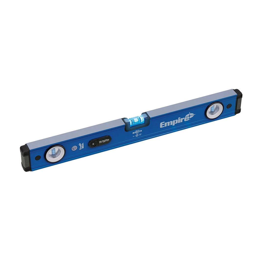 Empire is committed to delivering innovative solutions designed to meet the needs of the modern jobsite. The e95 UltraView LED level combines the professional features of the e75 True Blue box level with the patented, UltraView technology to provide superior vial visibility in dark, low and bright light applications. The patented, UltraView system uses dual LED’s, optical brightener and e-Band vials to provide high definition viewing in all conditions. Its IP54 rating meets the durability demands of the jobsite by protecting it from dust and water.
