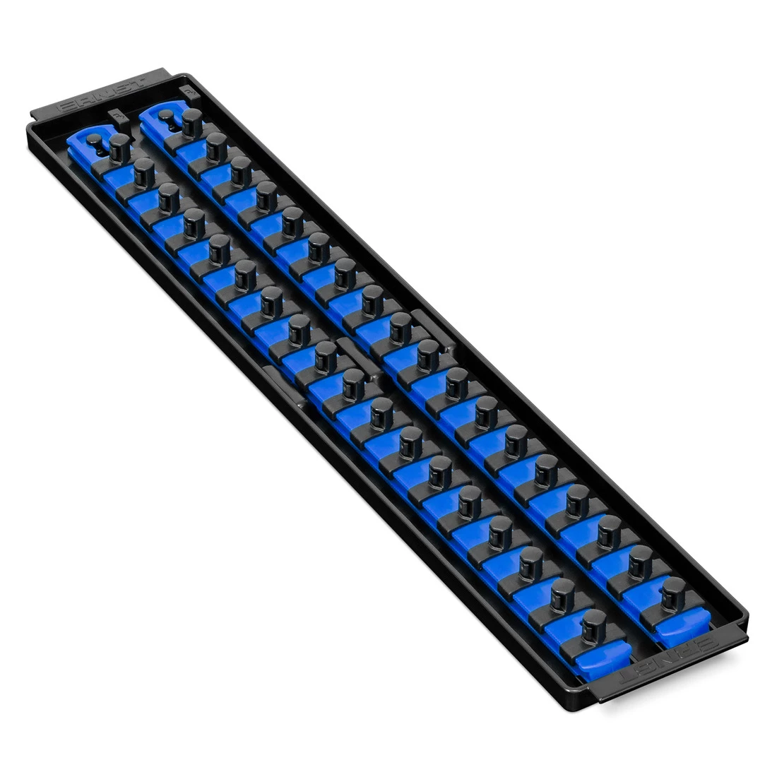 Versatility is a must for organizing any socket set. Capitalize on maximum possibilities with the Socket Boss from Ernst! Individual rails can be removed or switched for customization. Add or remove socket clips, label socket sizes with ID stickers, trade colors, swap out drive sizes, add ratchet and extension holders; the options are limitless for organizing your own set of sockets. Perfect for storage in the drawer, on the bench, or on the go. This compact set fits a large set of tools using a small amount of storage space. Easy to grab and go with handles on each end. Twist-Lock clips keep sockets secured for transport and prevent tool loss. US Patents 6,637,605 and 8,770,418, US 9,364,949, D725,993S.