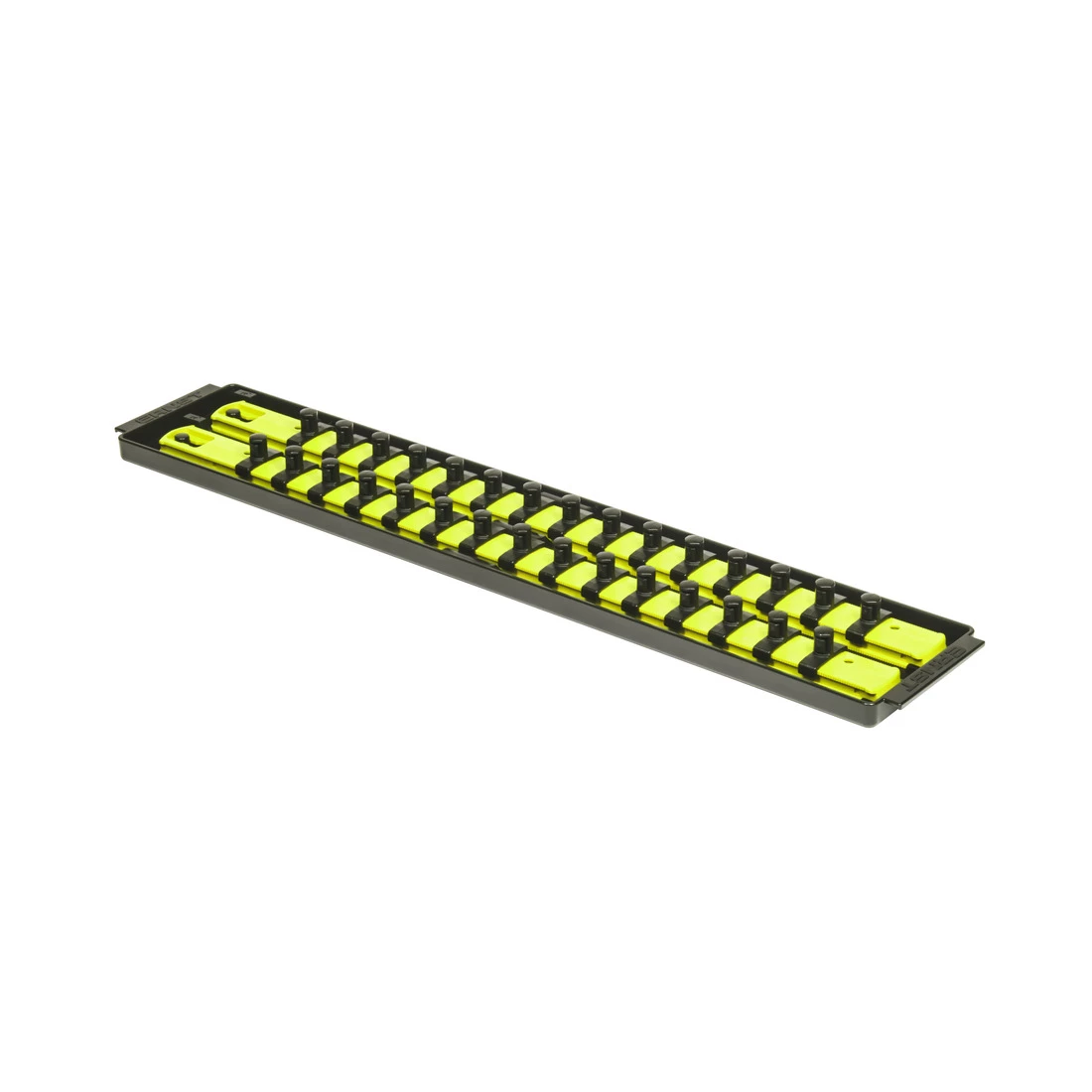 Versatility is a must for organizing any socket set. Capitalize on maximum possibilities with the Socket Boss from Ernst! Individual rails can be removed or switched for customization. Add or remove socket clips, label socket sizes with ID stickers, trade colors, swap out drive sizes, add ratchet and extension holders; the options are limitless for organizing your own set of sockets. Perfect for storage in the drawer, on the bench, or on the go. This compact set fits a large set of tools using a small amount of storage space. Easy to grab and go with handles on each end. Twist-Lock clips keep sockets secured for transport and prevent tool loss. US Patents 6,637,605 and 8,770,418, US 9,364,949, D725,993S.