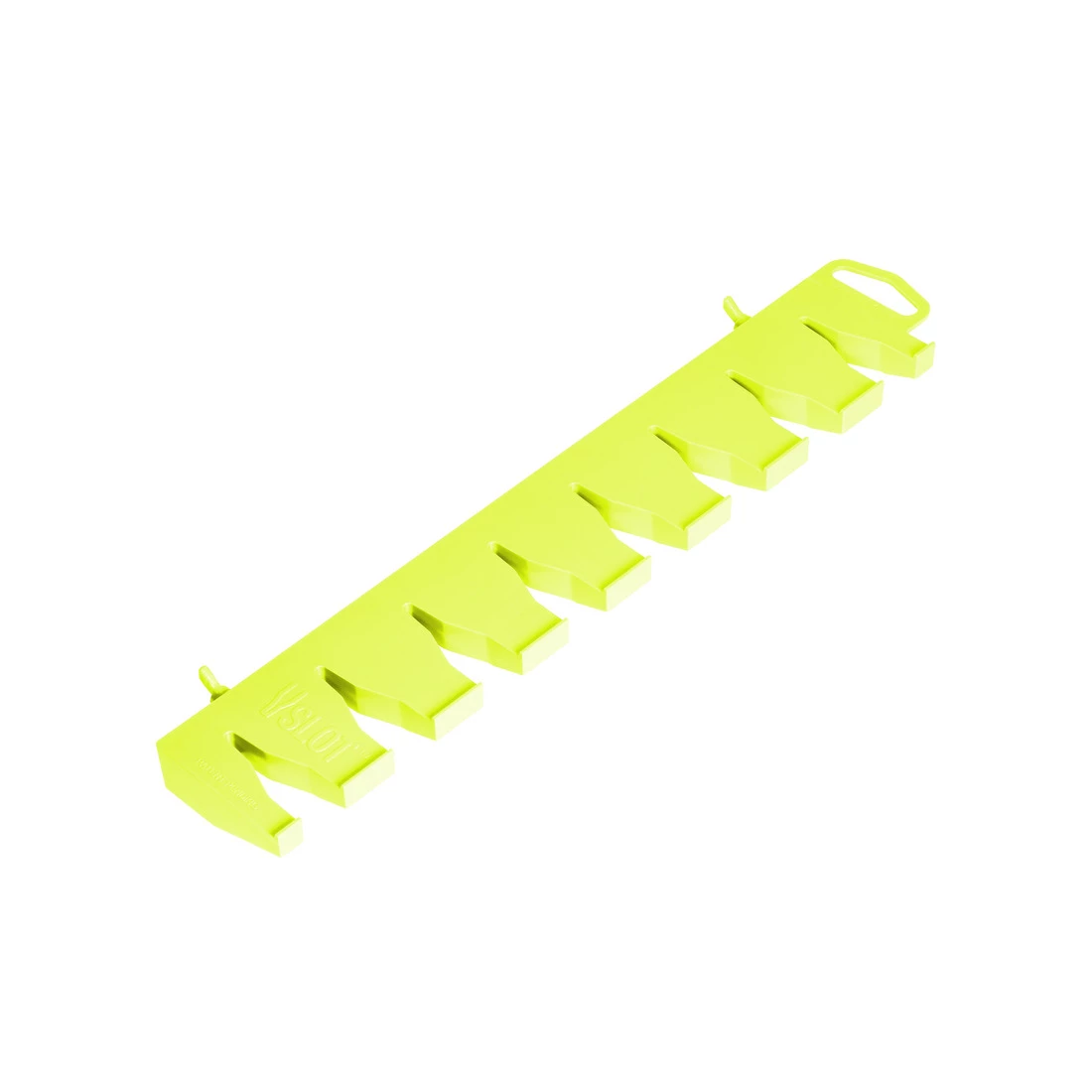 Perfect pegboard solution! Organize your garage or workspace with the V-Slot Screwdriver organizer. Designed for use on all common pegboard sizes. Holds a wide variety of tools. Tools tilt slightly for added stability on the wall. Patent US 9,597,791.