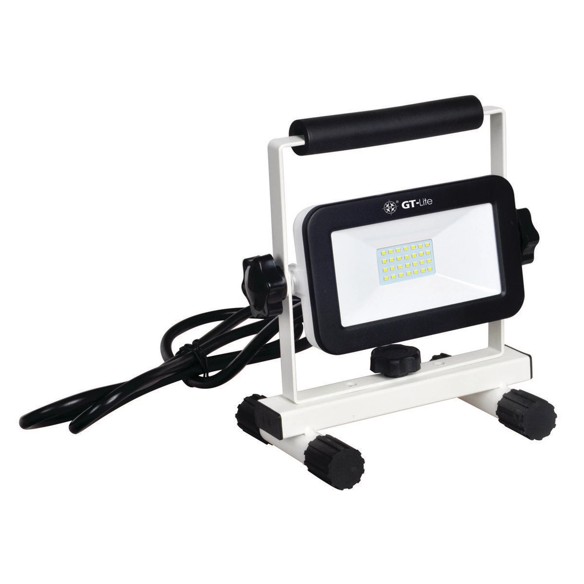 Big light comes in small packages with this 1,200 lumen portable work light. The perfect light for any project, this ruggedly constructed light is in its element on the worksite, in the workshop, or around the house. Energy efficient LED technology uses 88% less energy than the equivalent halogen work light and puts off less heat as well. Cool touch surface allows you to pick up and move or adjust the beam angle any time, without shutting the light off or waiting for it to cool down. Enjoy a long, maintenance-free product lifespan of 50,000 hours. Easily reach where light is needed most with the 5ft grounded power cord. Use with attached scissor stand or included H-Stand for best placement.