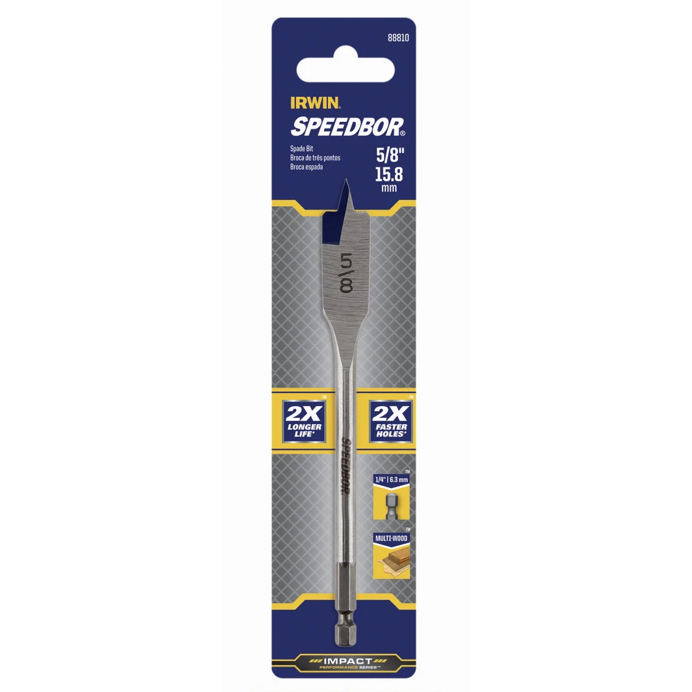 The improved SPEEDBOR Spade Bits now last 2X Longer and cut 2X Faster. Next-generation SPEEDBOR Spade Bits feature a chamfered cutting edge for durability in cutting wood and optimized point tip that is wider and longer than previous IRWIN spade bits to minimize splintering and control speed. Patented Blue-Groove cutting edge allows for a large cutting area for aggressive removal of wood chips and fast drilling.