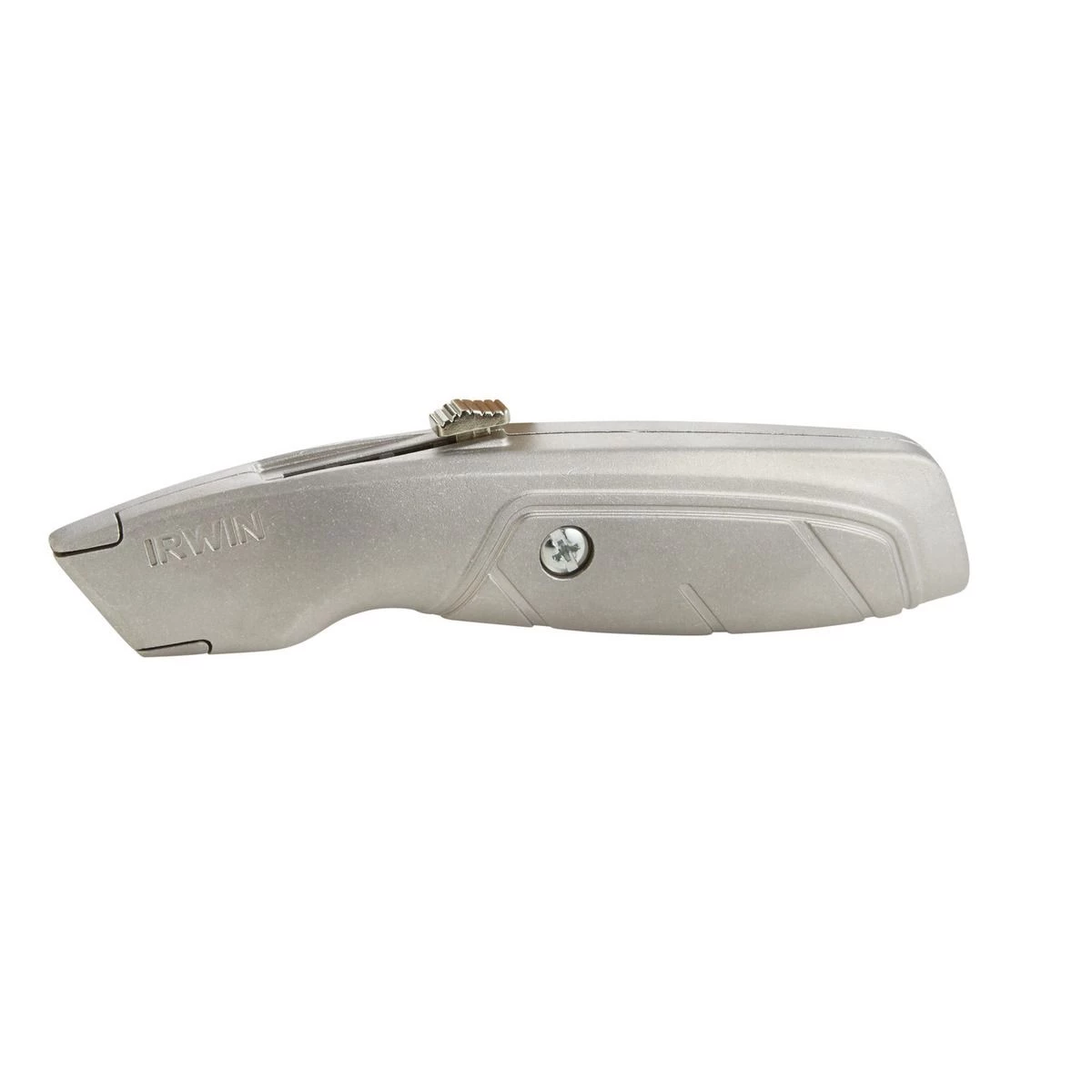 The IRWIN standard retractable knife features an optimized cutting angle for reduced fatigue. It includes 1 IRWIN bi-metal utility blade. It has a magnetic nose for easy blade changes.