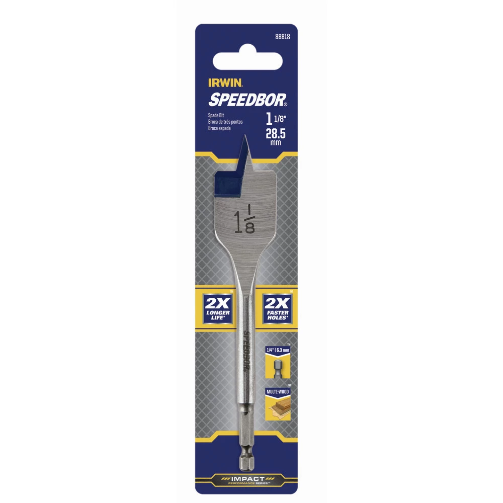 The improved SPEEDBOR Spade Bits now last 2X Longer and cut 2X Faster. Next-generation SPEEDBOR Spade Bits feature a chamfered cutting edge for durability in cutting wood and optimized point tip that is wider and longer than previous IRWIN spade bits to minimize splintering and control speed. Patented Blue-Groove cutting edge allows for a large cutting area for aggressive removal of wood chips and fast drilling.