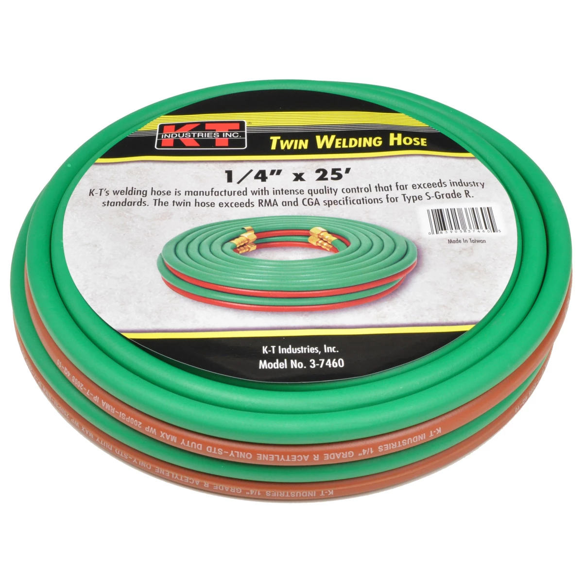 K-T hose is manufactured with intense quality control that far exceeds industry standards. The twin hose exceeds RMA & CGA specifications for type S grade R. Size 1/4″ x 25′