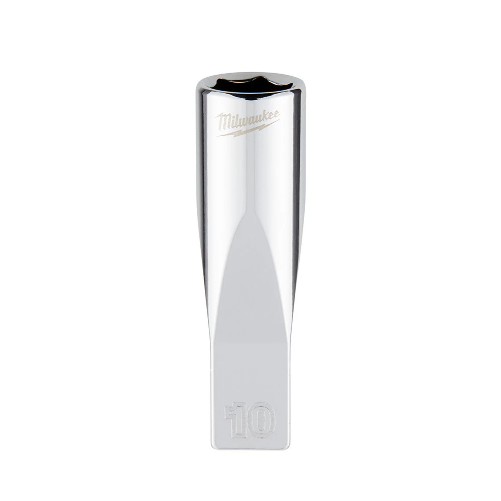The Milwaukee 1/4 in. drive 10mm metric 6-point deep socket was designed from the ground to be part of the most versatile socket family. The innovative socket design has four parallel flat sides, which deter rolling and are wrench-compatible. Socket sizes are stamped into the flats for improved easy-to-read visibility. Optimized socket geometry helps reduce bolt rounding and stripping.