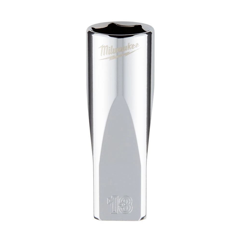 The Milwaukee 1/4 in. drive 13mm metric 6-point deep socket was designed from the ground to be part of the most versatile socket family. The innovative socket design has four parallel flat sides, which deter rolling and are wrench-compatible. Socket sizes are stamped into the flats for improved easy-to-read visibility. Optimized socket geometry helps reduce bolt rounding and stripping.
