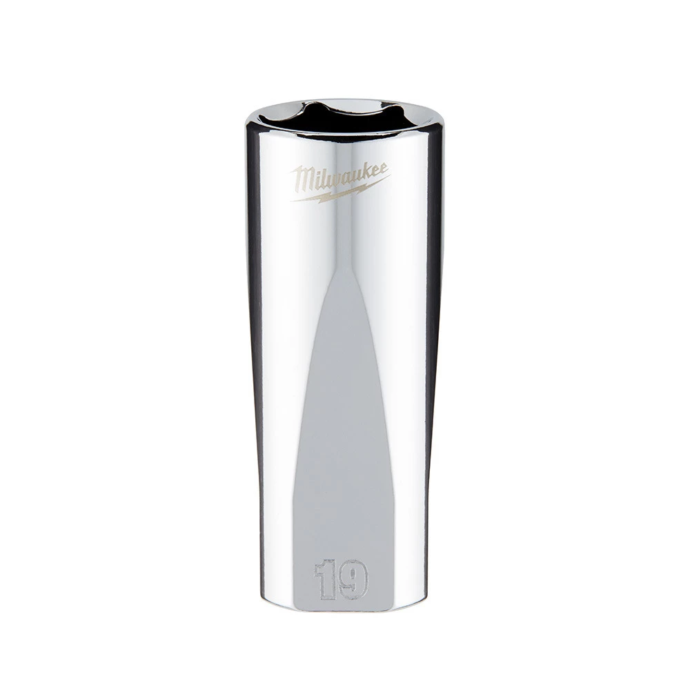 The Milwaukee 3/8 in. drive 19mm metric 6-point deep socket was designed from the ground to be part of the most versatile socket family. The innovative socket design has four parallel flat sides, which deter rolling and are wrench-compatible. Socket sizes are stamped into the flats for improved easy-to-read visibility. Optimized socket geometry helps reduce bolt rounding and stripping.