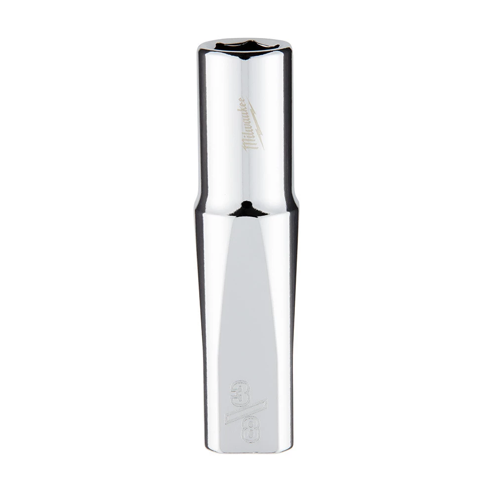 The Milwaukee 3/8 in. drive 3/8 in. SAE 6-point deep socket was designed from the ground to be part of the most versatile socket family. The innovative socket design has four parallel flat sides, which deter rolling and are wrench-compatible. Socket sizes are stamped into the flats for improved easy-to-read visibility. Optimized socket geometry helps reduce bolt rounding and stripping.