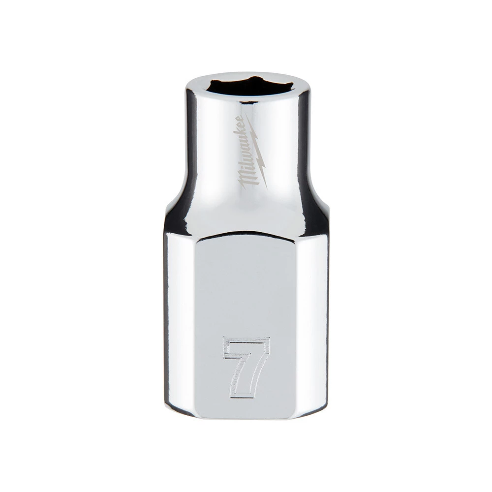 The Milwaukee 3/8 in. drive 7mm metric 6-point socket was designed from the ground to be part of the most versatile socket family. The innovative socket design has four parallel flat sides, which deter rolling and are wrench-compatible. Socket sizes are stamped into the flats for improved easy-to-read visibility. Optimized socket geometry helps reduce bolt rounding and stripping.