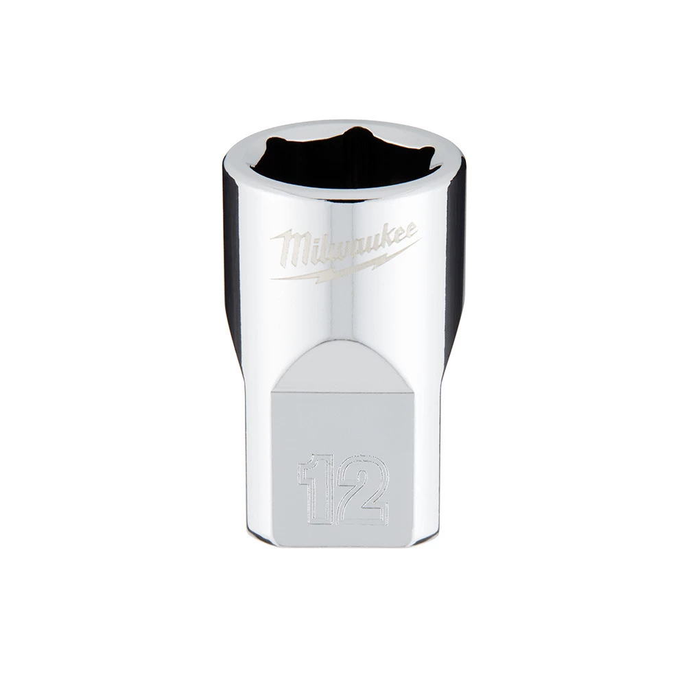 The Milwaukee 3/8 in. drive 12mm metric 6-point socket was designed from the ground to be part of the most versatile socket family. The innovative socket design has four parallel flat sides, which deter rolling and are wrench-compatible. Socket sizes are stamped into the flats for improved easy-to-read visibility. Optimized socket geometry helps reduce bolt rounding and stripping.