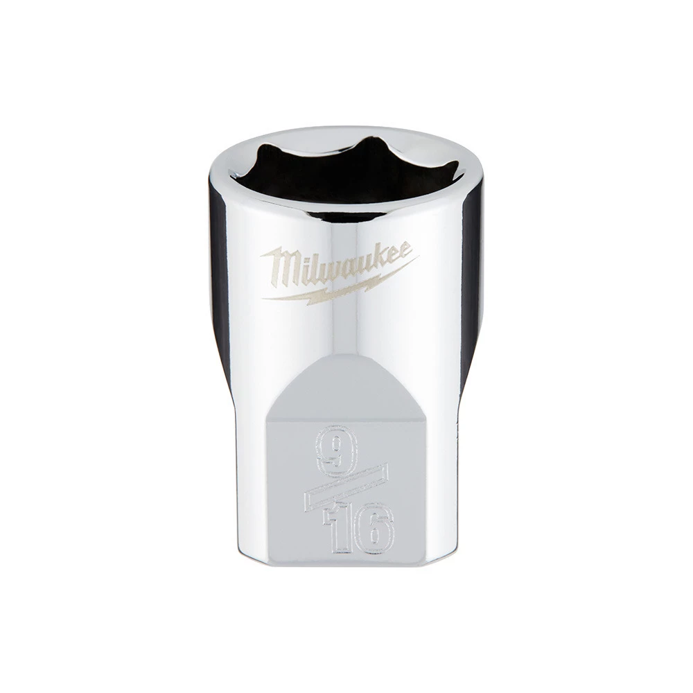 The Milwaukee 3/8 in. drive 9/16 in. SAE 6-point socket was designed from the ground to be part of the most versatile socket family. The innovative socket design has four parallel flat sides, which deter rolling and are wrench-compatible. Socket sizes are stamped into the flats for improved easy-to-read visibility. Optimized socket geometry helps reduce bolt rounding and stripping.
