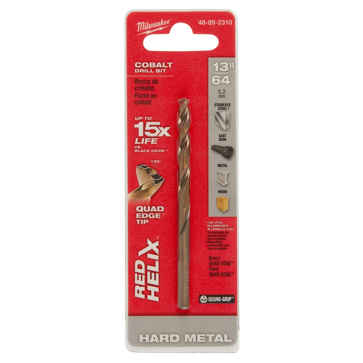 The MILWAUKEE RED HELIX Cobalt 13/64″ Drill Bit are engineered for extreme durability and longer life in hard metal applications. The Milwaukee Cobalt drill bits are designed with a VARIABLE HELIX that includes an aggressive 35 Helix Angle which ends at 15. The drill bits have QUADEDGE TIP to decrease heat buildup and drill faster. The 135 split point tip delivers a precision start and prevents walking for fast, accurate holes in Hard Metal, PVC and wood. The tapered drill bits feature a new ENHANCED TAPERED WEB that strengthens the bit’s core to increase flute durability. The cobalt twist drill bits are ideal for tough applications, providing up to 15X life vs. Black Oxide Drill Bits.