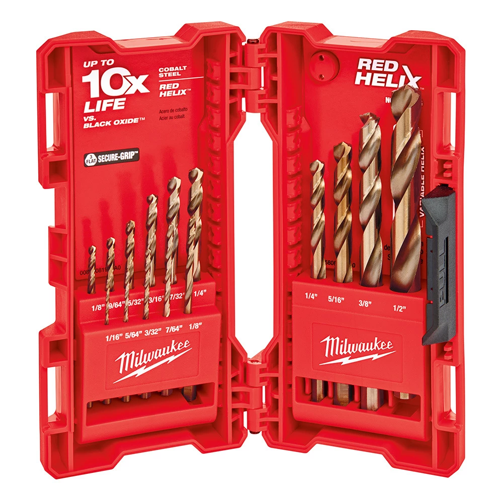 The MILWAUKEE RED HELIX Cobalt 15 Piece Drill Bit Set is engineered for extreme durability and longer life in hard metal applications. The Milwaukee Cobalt drill bits are designed with a VARIABLE HELIX that includes an aggressive 35 Helix Angle which ends at 15. The drill bits have QUADEDGE TIP to decrease heat buildup and drill faster. The 135 split point tip delivers a precision start and prevents walking for fast, accurate holes in Hard Metal, PVC and wood. The tapered drill bits feature a new ENHANCED TAPERED WEB that strengthens the bit’s core to increase flute durability. The cobalt twist drill bits are ideal for tough applications, providing up to 15X life vs. Black Oxide Drill Bits. This set includes 15 bits from 1/16″ to 1/2″.