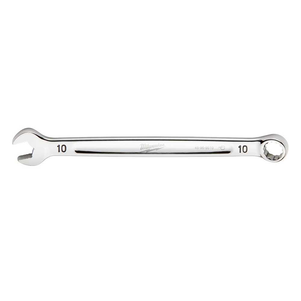 The Milwaukee10MM Metric Combination Wrench gets 25% more torque than smooth-faced wrenches with its MAXBITE Open-End Grip. In addition to providing increased torque, MAXBITE reduces rounding and stripping of nuts and bolts. This wrench is built from the ground up with an I-Beam handle for optimized comfort and durability. Ink-filled size labels allow for easy size identification and quick distinction between SAE and metric sets. The Milwaukee10MM Combination Wrench features a Lifetime Guarantee.