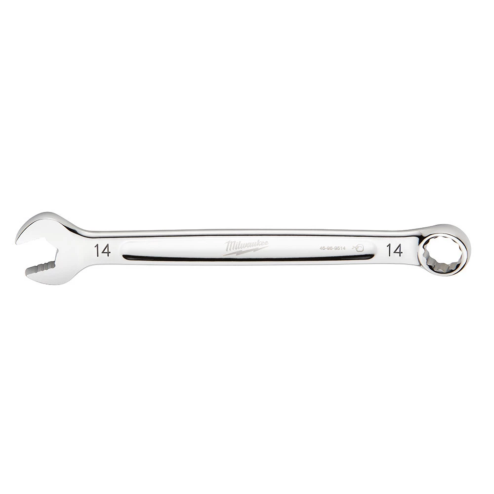 The Milwaukee14MM Metric Combination Wrench gets 25% more torque than smooth-faced wrenches with its MAXBITE Open-End Grip. In addition to providing increased torque, MAXBITE reduces rounding and stripping of nuts and bolts. This wrench is built from the ground up with an I-Beam handle for optimized comfort and durability. Ink-filled size labels allow for easy size ide+AP58ntification and quick distinction between SAE and metric sets. The Milwaukee14MM Combination Wrench features a Lifetime Guarantee.