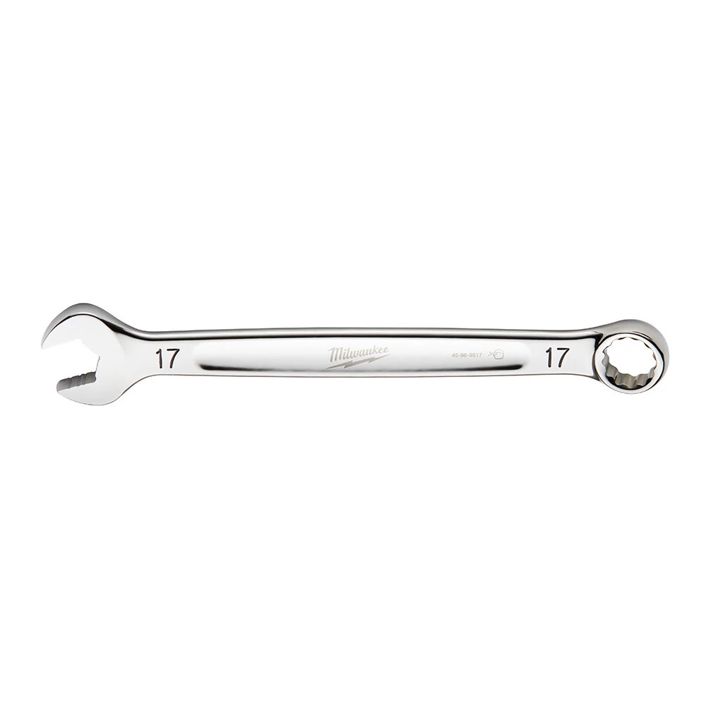The Milwaukee17MM Metric Combination Wrench gets 25% more torque than smooth-faced wrenches with its MAXBITE Open-End Grip. In addition to providing increased torque, MAXBITE reduces rounding and stripping of nuts and bolts. This wrench is built from the ground up with an I-Beam handle for optimized comfort and durability. Ink-filled size labels allow for easy size identification and quick distinction between SAE and metric sets. The Milwaukee17MM Combination Wrench features a Lifetime Guarantee.