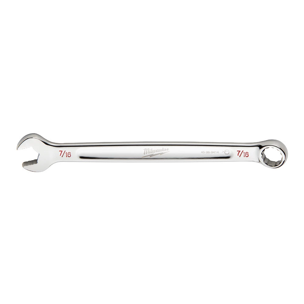 The Milwaukee7/16 in. SAE Combination Wrench gets 25% more torque than smooth-faced wrenches with its MAXBITE Open-End Grip. In addition to providing increased torque, MAXBITE reduces rounding and stripping of nuts and bolts. This wrench is built from the ground up with an I-Beam handle for optimized comfort and durability. Ink-filled size labels allow for easy size identification and quick distinction between SAE and metric sets. The Milwaukee7/16 in. SAE Combination Wrench features a Lifetime Guarantee.