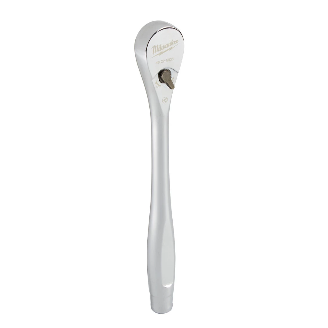 The Milwaukee3/8 in. 90-tooth drive ratchet provides just 4 of arc swing, allowing access work in tighter spaces. The slim profile design and flush directional lever offer better accessibility. The ratchet features an all-chrome, easy-to-clean finish.