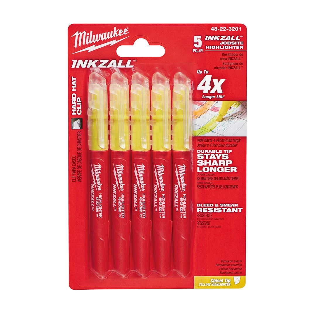 Milwaukee INKZALL jobsite highlighters are designed for jobsite performance. The durable tip stays sharp longer for extended marking and tracking. Bleed resistant ink drys quickly and resists smears. Extended cap-off time allows up to 4x longer life. The hard hat clip is designed to clip onto the brim of hard hats for easy access.
