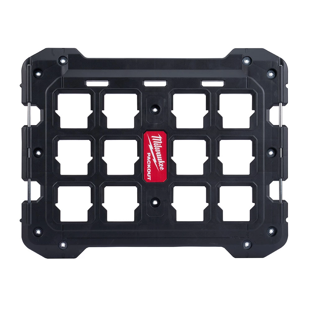The Milwaukee^ PACKOUT modular storage system is the industry’s most durable and versatile storage system. The PACKOUT mounting plate is constructed with impact resistant polymers, with up to a 100 lbs weight capacity when mounted to the floor and 50 lbs when mounted to walls. Metal reinforced mounting holes allow the mounting plate to be securely fastened to most surfaces, while metal reinforced tie-down points help secure job site supplies to the mounting plate. The PACKOUT modular storage system allows storage systems to be customized and built for easy transportation and organization of tools and accessories.