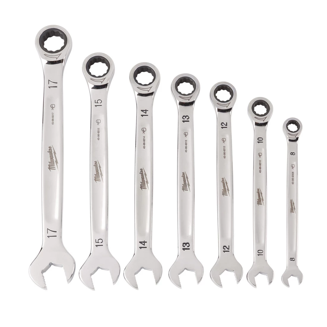 Milwaukee’s ratcheting combination wrenches offer an industry-leading 2.5 of arc swing, allowing our users to work quickly and efficiently even in the tightest of spaces. Our durable double-stacked pawls in the ratcheting mechanism offer longest ratchet life and best access with 144 ratcheting positions. The MAX BITE open-end grip improves the wrench’s grip on nuts and bolts, offering 25% more torque than smooth-faced wrenches. The comfortable I-Beam handle design allows superior user comfort. Milwaukee wrenches feature ink-filled size labels for easy size identification, as well as quick distinction between SAE and metric sets. The 15 pc. sets come in trays designed for steel storage drawers, allowing for efficient storage with no wasted space. The 7 pc. kits come in a portable, locking storage tray, offering organization both on and off the jobsite. Standing behind our products, Milwaukee offers a lifetime guarantee on all of our ratcheting combination wrench sets.